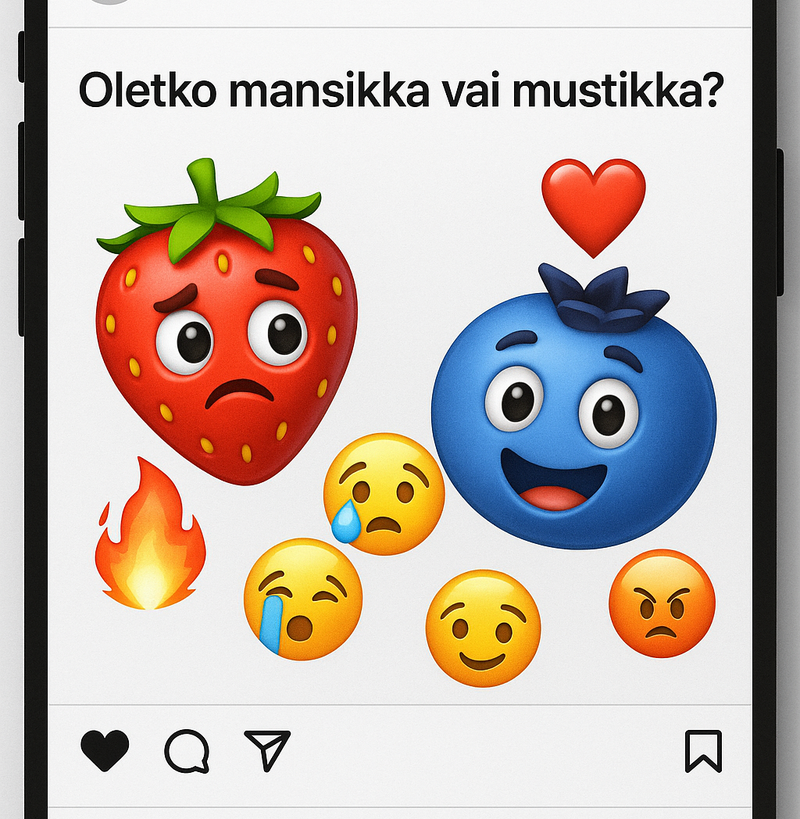 Kansanviisaudesta mediaviidakkoon, vastaan tulee täysin toisenlainen maasto. Some-alustat, uutisvirrat ja algoritmit ovat maailma, jossa mansikat ja mustikat ovat poliittisesti latautuneita symboleja, jotka määrittävät, missä rintamassa seisot. Oletko kenties mansikka, joka haluaa säilyttää perinteet ja kansallisen yhtenäisyyden? Vai mustikka, joka ajattelee monikulttuurisesti rajojen yli?